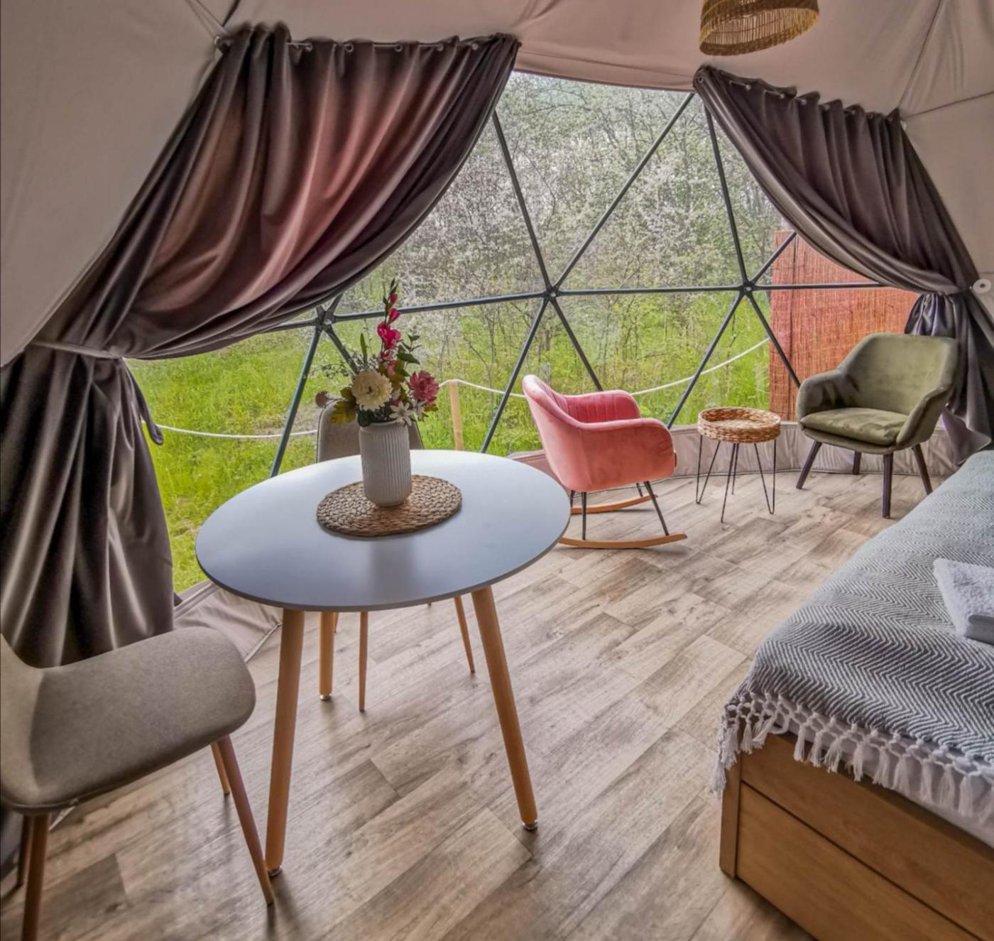 Namiot. The tent offers air conditioning, a private entrance, as well as a private bathroom boasting a shower and a hairdryer. Meals can be prepared in the well-fitted kitchenette, which is fitted with a stovetop, a refrigerator, kitchenware and a microwave. Among the room amenities are a tea and coffee maker, a seating area, a dining area as well as outdoor furniture and garden views. The unit has 1 bed. Namiot - 3 osobowy. Powierzchnia pokoju ok.: 30 mkw. ;